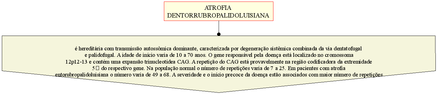 Degeneração sistêmica combinada da via dentatofugal e palidofugal. O gene responsável pela doença está localizado no cromossoma 12p13.31 e contém uma expansão trinucleotídeo CAG. A repetição do CAG está provavelmente na região codificadora da extremidade 5’ do respectivo gene. Na população normal o número de repetições varia de 7 a 25. Em pacientes com atrofia dentorubropalidoluisiana o número varia de 49 a 68. A severidade e o início precoce da doença estão associados com maior número de repetições.