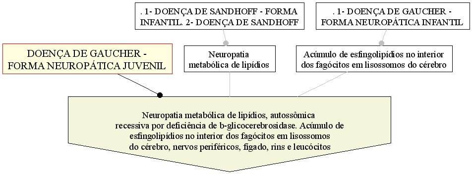. Cognição comprometida. Rigidez muscular, recorrente. Retardo mental. Perda lentamente progressiva do intelecto. Esplenomegalia. Hepatomegalia. Abalos musculares. Ataxia. Laboratório: MORFO do cérebro:. Perda neuronal com neuronofagia e acúmulo de glucocerebrosideos nos neurônios. Erro em