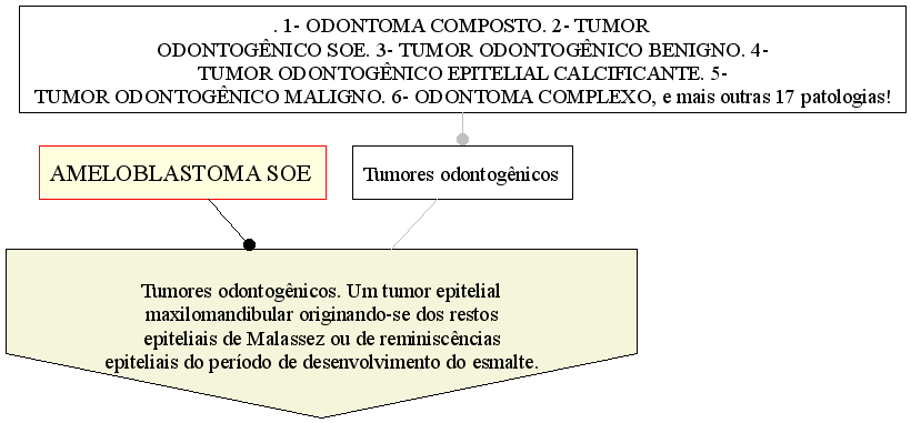 Ameloblastoma Adamantinoma; Tumor odontogênico escamoso; Ameloblastoma. Tumor odontogênico de origem ectodérmica. Amel (inglês antigo) = esmalte. Descrita em 1827 por James Cusack (1788-1861), cirurgião irlandês como adamantinoma e renomeada em 1930 por RH Ivey (-) e HR Churchill (-). Sexo: Não informado. Idade: Não informada.Distribuição.Diagnóstico diferencial. Epidemiologia: Clínica: