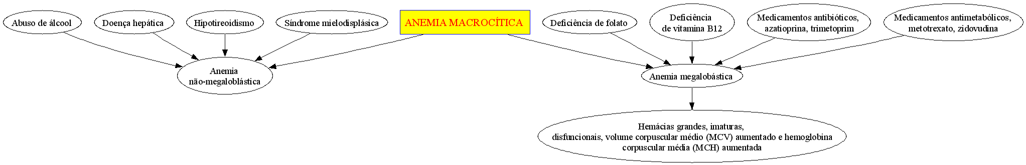 Megalobástica: deficiência de folato, deficiência de vitamina B12. Não-megaloblástica: Síndrome mielodisplásica, quimioterapia & Eritrócitos maiores que o normal, volume corpuscular médio (MCV) aumentado e hemoglobina corpuscular média (MCH) aumentada.