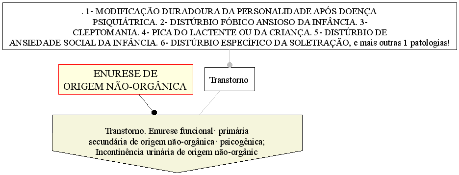 Sexo: Não informado. Idade: Não informada.Distribuição.Diagnóstico diferencial. Epidemiologia: . PROGNÓSTICO: A enurese. pode existir, de modo contínuo, depois do nascimento ou ser precedida de um período de controle. de função vesical. Pode-se acompanhar de um transtorno mais generalizado das emoções ou do comportamento.