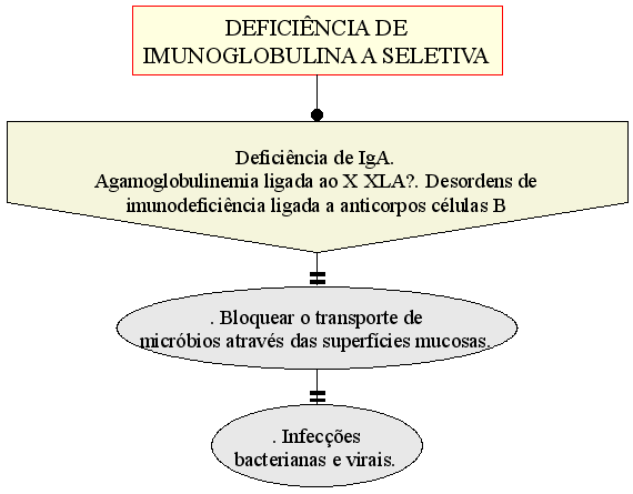 Deficiência de imunoglobulina A IMUNODEFICIÊNCIAS DE LEUCÓCITOS B. (IgA); Deficiência seletiva de IgA.; Deficiência seletiva de imunoglobulina A; Deficiência isolada de IgA; Deficiência de IgA; IgA deficiency; Selective IgA deficiency. Antocorpo das mucosas, está presente na saliva, nas lágrimas e em todas as outras secreções de muco. Descrita em 1953 por P Grabar (-) e CA Williams Jr (-). Sexo: Não informado. Idade: Não informada.Distribuição.Diagnóstico diferencial. Epidemiologia: Uma das 4 imunodeficiências mais frequentes na infância. PROGNÓSTICO: Artrite reumatóide & @Bloquear o transporte de micróbios através das superfícies mucosas & @Infecções bacterianas e virais.
