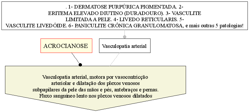 . Pés azulados. Mãos azuladas. Hipotermia, local. Sudorese aumentada, local. Edema localizado, leve. Cianose, local. Melhora com o aumento da idade. Melhora com a gravidez. Laboratório: Erro em
