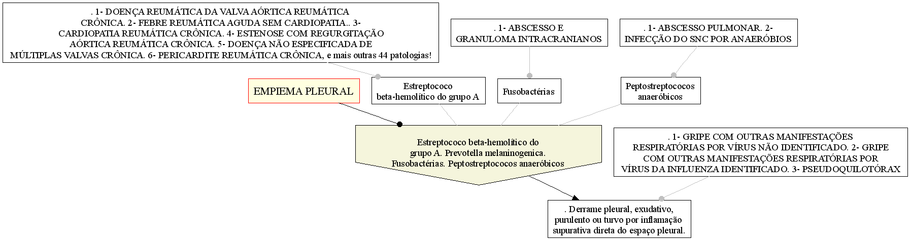 Estreptococo beta-hemolítico do grupo A. Prevotella melaninogenica. Fusobactérias. Peptostreptococos anaeróbicos & Derrame pleural, exudativo, purulento ou turvo por inflamação supurativa direta do espaço pleural.