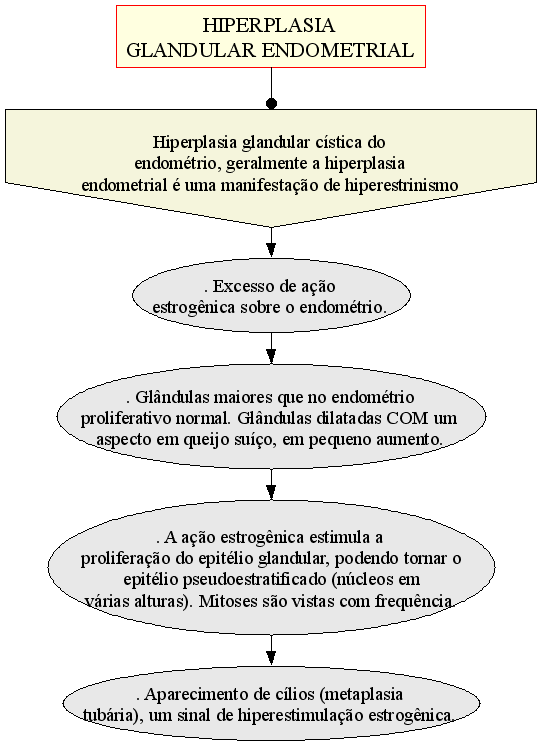 Idade: Não informada.Distribuição.Diagnóstico diferencial. Epidemiologia: . Frequentemente ocorre com ausência de ovulação próximo ao período da menopausa. A estimulação estrogênica por ciclos anovulatórios, nuliparidade, obesidade e estrogênios exógenos (em maiores quantidades que as existentes em pílulas anticoncepcionais) causa hiperplasia endometrial que pode progredir para carcinoma endometrial se a estimulação estrogênica continuar. A hiperplasia endometrial atípica progride para câncer endometrial em cerca de 25% dos casos. Geralmente a hiperplasia endometrial é uma manifestação de hiperestrinismo, e pode causar sangramento vaginal irregular e abundante. PROGNÓSTICO: Neoplasia maligna do endométrio, em 25% dos casos.