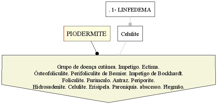 Grupo de doença cutânea. Impetigo. Ectima. Ósteofoliculite. Perifoliculite de Besnier. Impetigo de Bockhardt. Foliculite. Furúnculo. Antraz. Periporite. Hidrosadenite. Celulite. Erisipela. Paroníquia. abscesso. Flegmão.